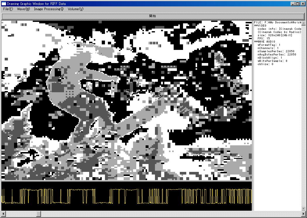 AVI/WAVE 等の表示を行うためのプログラム(dgwriff)に画像処理機能を追加し、若干修正等を加えたものです。dgwriff の動作確認を行っていくと、動作環境によってコーデックおよびMP3の再生用のドライバの検索が上手くできなくて再生できない場合も発生するようです。その点の修正等は行っていません。情報等があればご報告おねがいします m(__)m。mp3の再生位置の調整も若干おかしいかも??です。 今回のソースには、Visual Studio(VC 6,7,8) のデバッグ環境も追加しておきます(VC6: dgwriff.dsw, VC7: dgwriff-7.0.vcproj, VC8: dgwriff.vcproj)。自宅のVisual Studio 2005(VC++ 8)でデバッグしていると、sprintf,strcat 等は古いからもう使用するな、というワーニングが大量に出てくるようになっていたのですが、